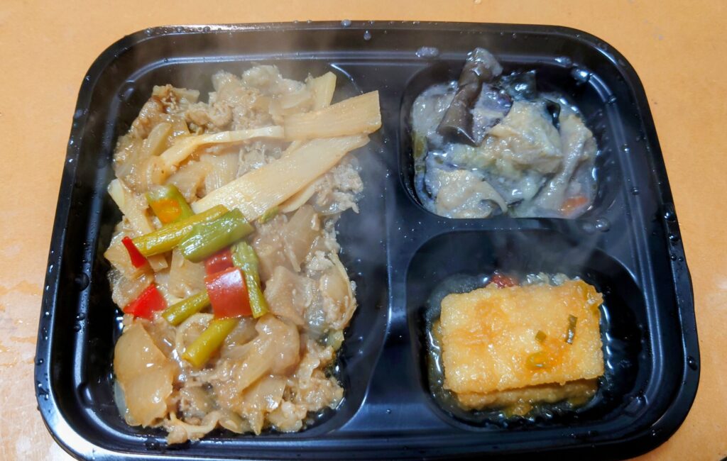 二つ目は、「牛肉とたけのことアスパラのオイスターソース炒め」で、副菜は「茄子のみそだれ和え🍆」と「揚げ出し豆腐おろしだれ」です。
